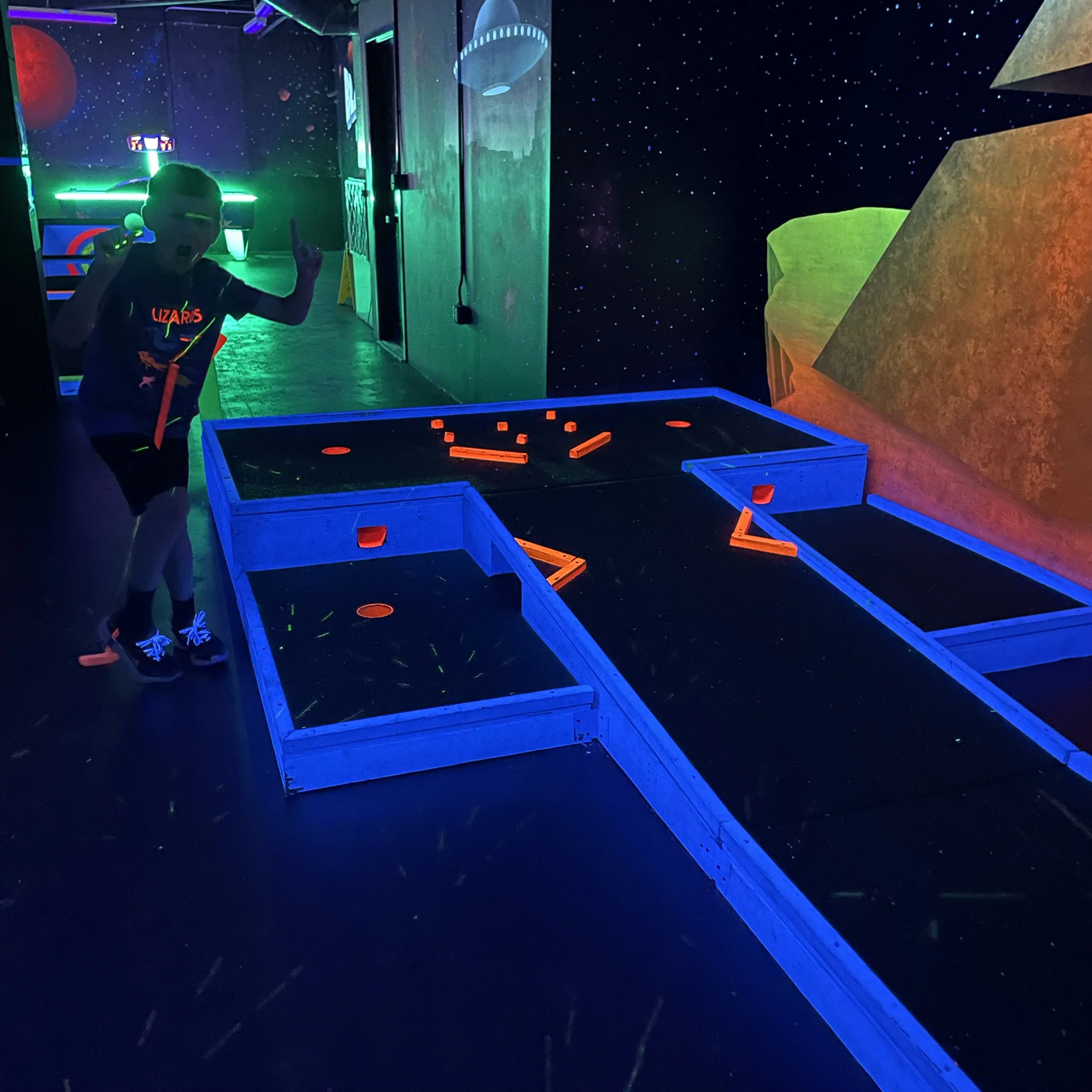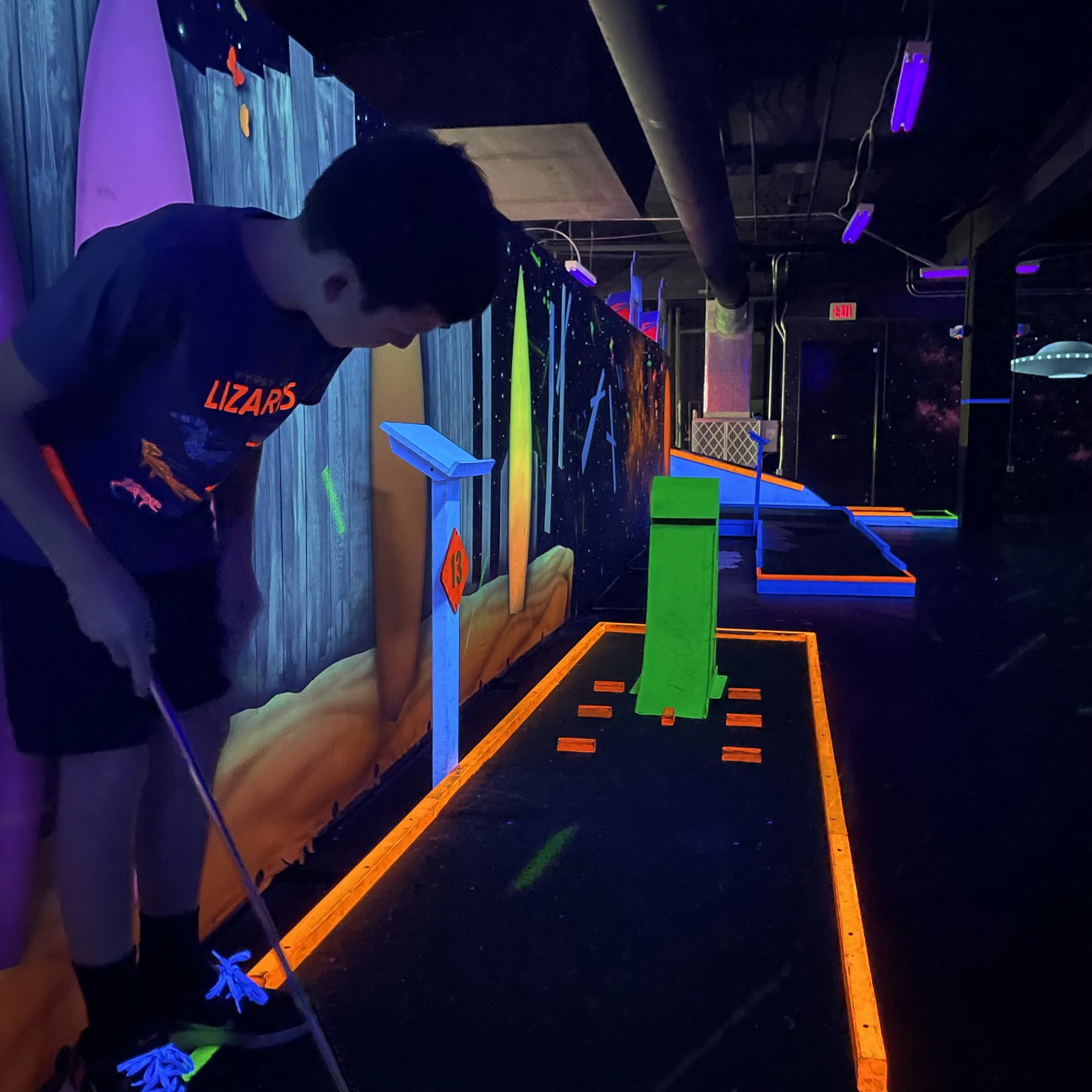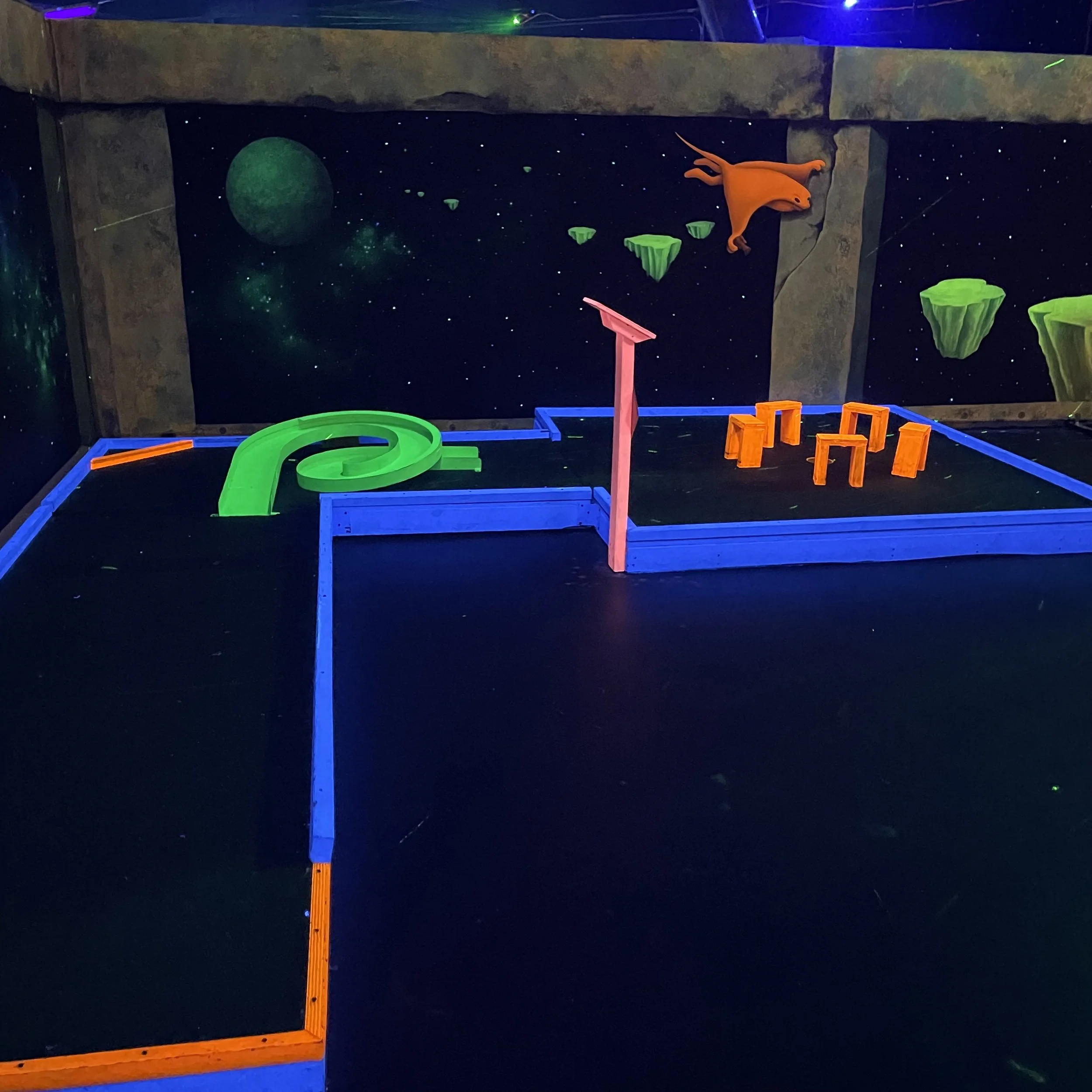 The 3D at this place is straight up wild. At first glance, the room has a bit of an ocean effect, with waves of light rippling across the ground. When you put the glasses on, this causes an insanely disorienting effect where you perceive the ground as 3-dimensional. It makes swings feel like they’re going to go above the ball. This sounds like a criticism, but it actually works well for a challenge. I will admit, though, that the effect gave me a headache after about 3 holes and I had to retire my 3D glasses. The kid found it astounding, however, which is what you really want from a blacklight joint.